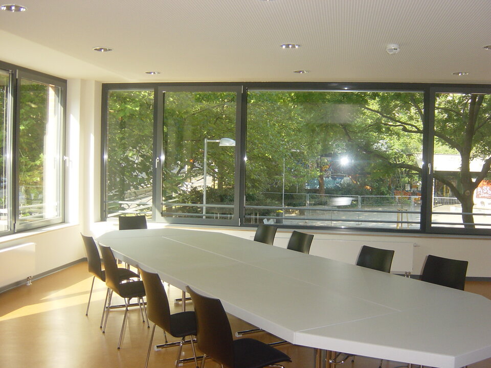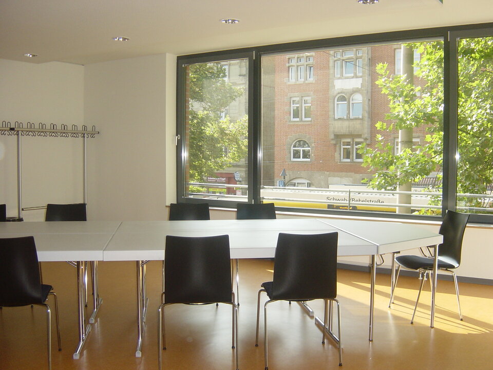Ein kleiner gemütlicher quadratisch geschnittener Sitzungsraum mit zwei Fensterfronten hin zur Bebelstraße und Richtung Jugendhaus West.